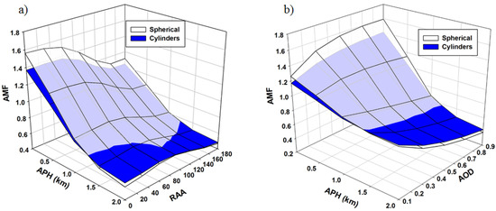 To investigate the effect of aerosol shape on AMF, we calculated AMF for two types of aerosol shape (spherical and cylindrical) as a function of APH and RAA (Figure 11a), and as a function of APH and AOD (Figure 11b). Large AMF values are found for both spherical and cylindrical aerosol shapes at RAA of 0° and an APH of 0 km, whereas AMF has the smallest value at RAA of 160° due to a back-scattering phase function that is smaller than that in the forward direction [26]. The AMF difference between spheres and cylinders is ~14% at an APH of 0 km and RAA of 0°, is smaller under low-APH conditions, and becomes large at high AOD. For both spherical and cylindrical aerosols, the change in APH from 0 to 2 km leads to a significant change in AMF (spherical: ~180%; cylindrical: ~130%), especially under high-AOD and low-RAA conditions. The aerosol shape is also found to have a noticeable effect on AMF under high-AOD and small-RAA conditions.