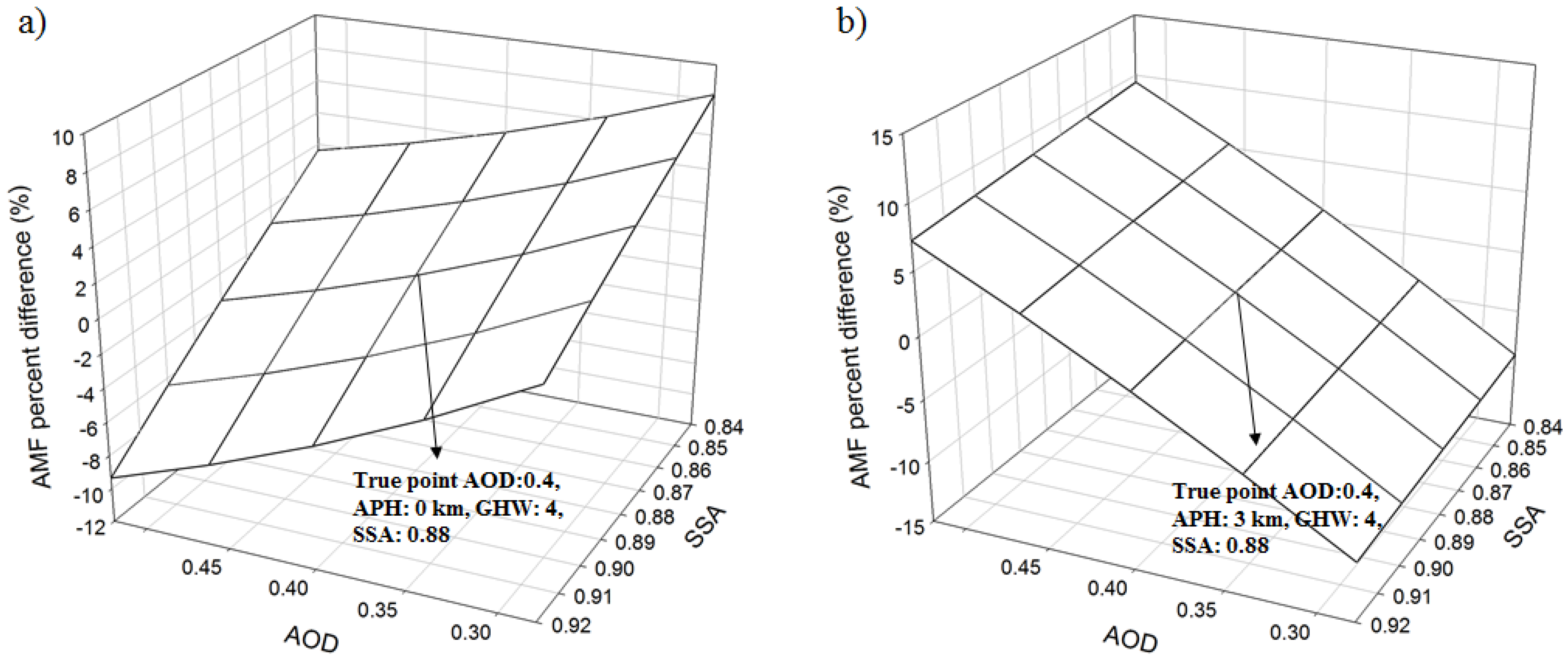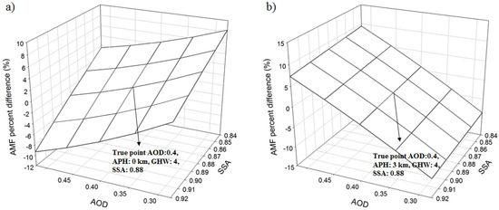 (a) Percent difference in AMF calculated with various AOD and SSA values compared with the true AMF calculated with AOD = 0.4 and SSA = 0.88 under conditions of APH = 0 km and HW = 4 km; and (b) those under the same conditions but for APH = 3 km.