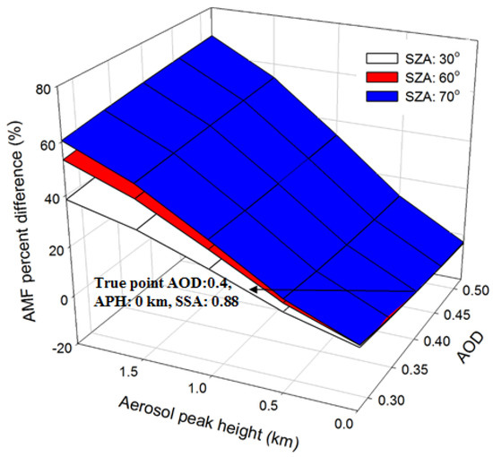 Percent difference in AMF calculated with various APH, AOD, and SZA values compared with the true AMF calculated with APH = 0 km, AOD = 0.4, and various SZA (30°, 60°, and 70°) with SSA = 0.88 and HW = 5 km.