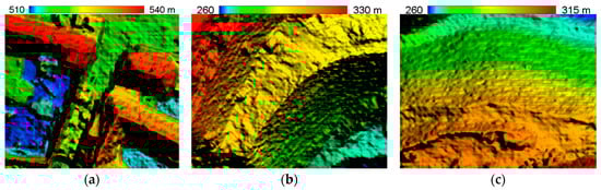 In the following experiments, some of the figures for showing DSMs (without color bar) used a default color scale which was consistent with reference data (Figure 9b), and other figures showed DSMs with adaptively scaled color range (with color bars) in order to show more details.