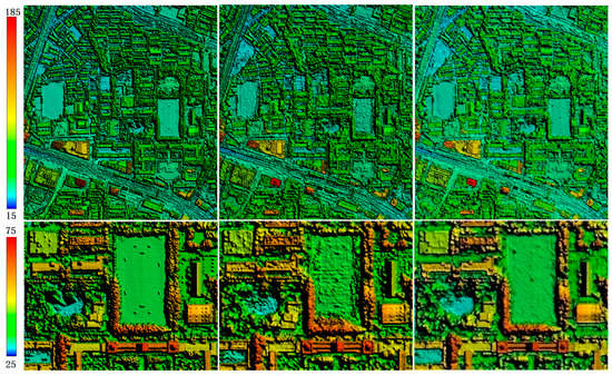In order to verify the advantage of the proposed elevation-step-robust cost calculation, both traditional method (the cost calculation method of the standard VLL) using GSD as the constant elevation step and proposed method using an adaptive elevation step, were employed to generate DSMs with different GSDs, namely 0.5 m, 5 m, and 10 m. As shown in Figure 10, the first row is the results of the traditional method, and the second row displays DSMs generated by the proposed method. When the GSD was 0.5 m, both methods achieved good results. When the GSD was 5 m, result of the traditional method degenerated significantly, especially at the high building area at the left bottom of the Figure 10b. When the GSD was 10 m, result of the traditional method was generally wrong, which was not able to depict the terrain surface, while the result of the proposed method was generally correct, though degeneration of details existed.