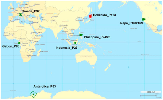ALOS-2 has a worldwide observation scenario and the ScanSAR mode is mainly used in descending mode (the flight direction from north to south at noon). Therefore, all paths except Hokkaido_P123 are descending. By using the Philippine and Napa archives, the difference between the neighboring paths is compared. According to the ALOS-2 basic observation scenario, a maximum of fifteen acquisitions are expected for the worldwide descending ScanSAR observation, while seven acquisitions are expected for the Japan ascending ScanSAR observation from 8 February 2015, to 30 September 2016. However, due to the observation strategy, polar regions e.g., Antarctica_P53, have less scheduled observations on purpose. In addition, some acquisitions were cancelled due to conflict with emergency observations in response to natural hazards such as earthquakes, storms and floods. Note that all data and parameters are derived from the ALOS-2 standard products.