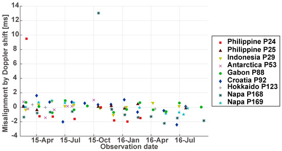 Figure 2 shows the misalignment plot caused by the Doppler shift. Two large shifts, Philippine_P24 at 11 April 2015 (9.49 ms) and Napa_P168 at 16 October 2015 (13.02 ms), were found. However, the standard deviation (STD) of the Doppler shifts was 1.93 ms including the large shifts. The large shifts were probably caused by the orbital maneuver soon before the observation. In other words, if the burst alignment system had no error nor randomness, the misalignment of the ALOS-2 ScanSAR data will be 1.93 ms caused by the Doppler centroid shift and has 99% in the burst overlap ratio.