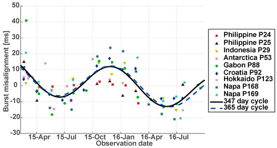 The extreme values for Equations (8) and (9) were calculated as shown in Table 3. As a result, the extreme values mostly distribute within two weeks. That is, the first local minimum (earliest observation) distributes within 5 days of June in 2015, while the local maximums (latest observation) were on 27 and 28 November 2015. As their adjusted R2 were 0.54 and 0.52, the difference of two functions is small. The root mean squared errors (RMSEs) of these curves are 7.66 ms and 7.65 ms. That is, if this seasonal component was subtracted by these equations, the burst misalignment will shrink to 7.66 ms and 7.65 ms for a 347-day cycle and a 365-day cycle, respectively. Here again, two curves are close to each other. The derived 347-day cycle is probably over fitted to the observation results. In addition, there is no 347-day cycle in the Earth’s precession and nutation.