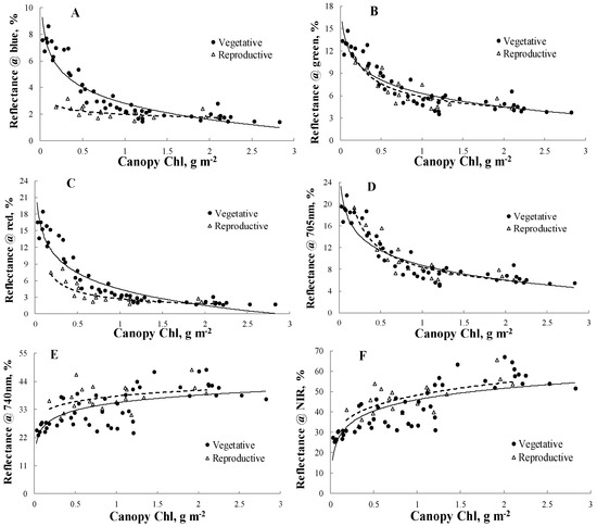 For the reflectance vs. canopy Chl relationships in the photosynthetically-active radiation (PAR) spectral region, there was a substantial and statistically-significant hysteresis between the two phenological stages in maize (Figure 1A–D; Table 2). In the PAR MSI spectral bands, maize reflectance decreased with an increase in canopy Chl for both the vegetative and reproductive stages. However, for low to moderate canopy Chl (below 2 g·m−2), reflectance in the vegetative stage was consistently higher than in the reproductive stage (Figure 1A–D). In the green (around 560 nm) and shortwave red edge (around 705 nm) bands, the difference in reflectance between the two stages was somewhat smaller than in the blue and the red bands (Figure 1B,D). In the longwave red edge (around 740 nm) and NIR bands, reflectance increased with increases in canopy Chl, and the difference in reflectance between the two stages was statistically significant only for the longwave red edge band (Figure 1E,F; Table 2). However, the significance of this difference was weaker than that of the visible and shortwave red edge bands (p-value = 0.0015 for longwave red edge band vs. p-value < 10−6 for visible and shortwave red edge bands).