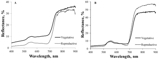 Reflectance spectra of crops with similar canopy Chl in the vegetative and reproductive stages. (A) Maize spectra collected in the vegetative stage (21 June, canopy Chl = 0.98 g·m−2) and in the reproductive stage (6 September, canopy Chl = 0.99 g·m−2). (B) Soybean spectra collected in the vegetative stage (8 July, canopy Chl = 0.52 g·m−2) and in the reproductive stage (12 September, canopy Chl = 0.51 g·m−2).