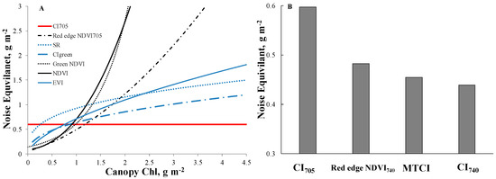 Generic algorithms were developed using 10-fold cross-validation procedures to estimate canopy Chl in both crop species during the entire growing season. Noise equivalent values were calculated for these algorithms (Figure 5). Normalized difference VIs using NIR and either red, green or 705-nm reflectance (NDVI, green NDVI and red edge NDVI705) accurately estimated low canopy Chl values; however, the uncertainties for canopy Chl >1 g·m−2 increased almost exponentially (Figure 5A). The noise equivalents of VIs using NIR and either green or red bands (CIgreen, SR and EVI) were two-fold higher than those using red edge and NIR bands (red edge NDVI740, CI740, MTCI and CI705). Very close linear relationships were found for red edge NDVI740, CI740, MTCI (Figure 5B) and CI705 (Figure 5A,B). Note that CI705 was less accurate in estimating canopy Chl than CI740 (Figure 5B). CI740, red edge NDVI740 and MTCI outperformed other VIs tested with noise equivalent values below 0.5 g·m−2 for the whole range of canopy Chl variation (Figure 5B).