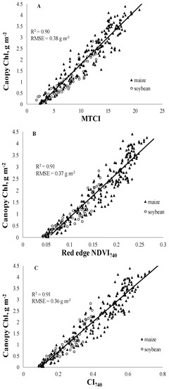 CI740, red edge NDVI740 and MTCI were used in established generic algorithms for canopy Chl estimation in maize and soybean combined (Figure 6, Table 4). All of these VIs were able to accurately estimate canopy Chl for the two crops combined with R2 above 0.9 and RMSE below 0.38 g·m−2.