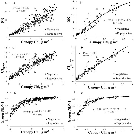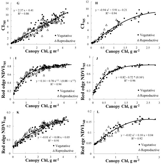 Relationships of VI vs. canopy Chl during both growth stages for SR in maize (A), SR in soybean (B), CIgreen in maize (C), CIgreen in soybean (D), green NDVI in maize (E), green NDVI in soybean (F), CI705 in maize (G), CI705 in soybean (H), red edge NDVI705 in maize (I), red edge NDVI705 in soybean (J), red edge NDVI740 in maize (K) and red edge NDVI740 in soybean (L). The solid line represents the best-fit-function of VI vs. canopy Chl developed using samples from the vegetative and reproductive stages combined.