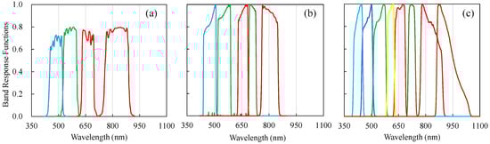 Band response functions for: FORMOSAT-2 (a); RapidEye (b); and WorldView-2 (c) satellite sensors used in this study.