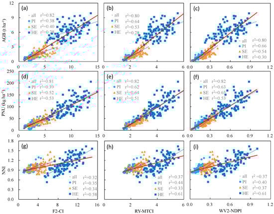 Relationships between: FORMOSAT-2-based Chlorophyll Index (CI) (a); RapidEye-based MERIS Terrestrial Chlorophyll Index (MTCI) (b); WorldView-2-based Nitrogen Planar Domain Index (NDPI) (c), and aboveground biomass (AGB); FORMOSAT-2-based CI (d); RapidEye-based MTCI (e); WorldView-2-based NDPI (f), and plant N uptake (PNU); and FORMOSAT-2-based CI (g); RapidEye-based MTCI (h); WorldView-2-based NDPI (i), and N nutrition index (NNI), at the panicle initiation (PI), stem elongation (SE), heading (HE), and across all stages. The relationships between VIs and N status indicators across growth stages are indicated by the red lines.