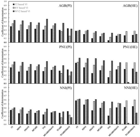 Comparison of different vegetation indices (VIs) calculated using FORMOSAT-2 (F2), RapidEye (RY) and WorldView-2 (WV2) satellite data for the relationships with aboveground biomass (AGB), plant N uptake (PNU), and N nutrition index (NNI) at the panicle initiation (PI) and heading (HE) stages, respectively.