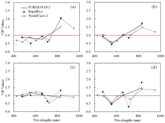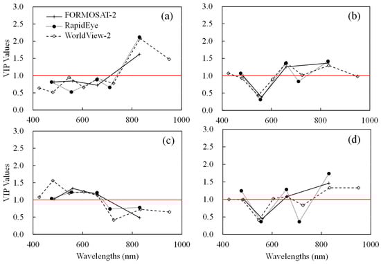 Variable Importance in Projection (VIP) values as function of wavelengths formatted to FORMOSAT-2, RapidEye, and WorldView-2 spectra for plant N uptake (PNU) estimation at: the panicle initiation (PI) (a); stem elongation (SE) (b); heading (HE) (c); and across stages (d).