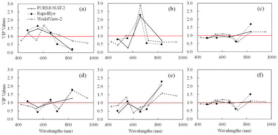 Variable Importance in Projection (VIP) values as function of wavelengths formatted to FORMOSAT-2, RapidEye, and WorldView-2 spectra for plant N concentration (PNC) estimation at: the panicle initiation (PI) (a); stem elongation (SE) (b); and heading (HE) (c) stages; and for N nutrition index (NNI) estimation at: the PI (d); SE (e); and HE (f) stages.