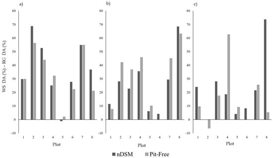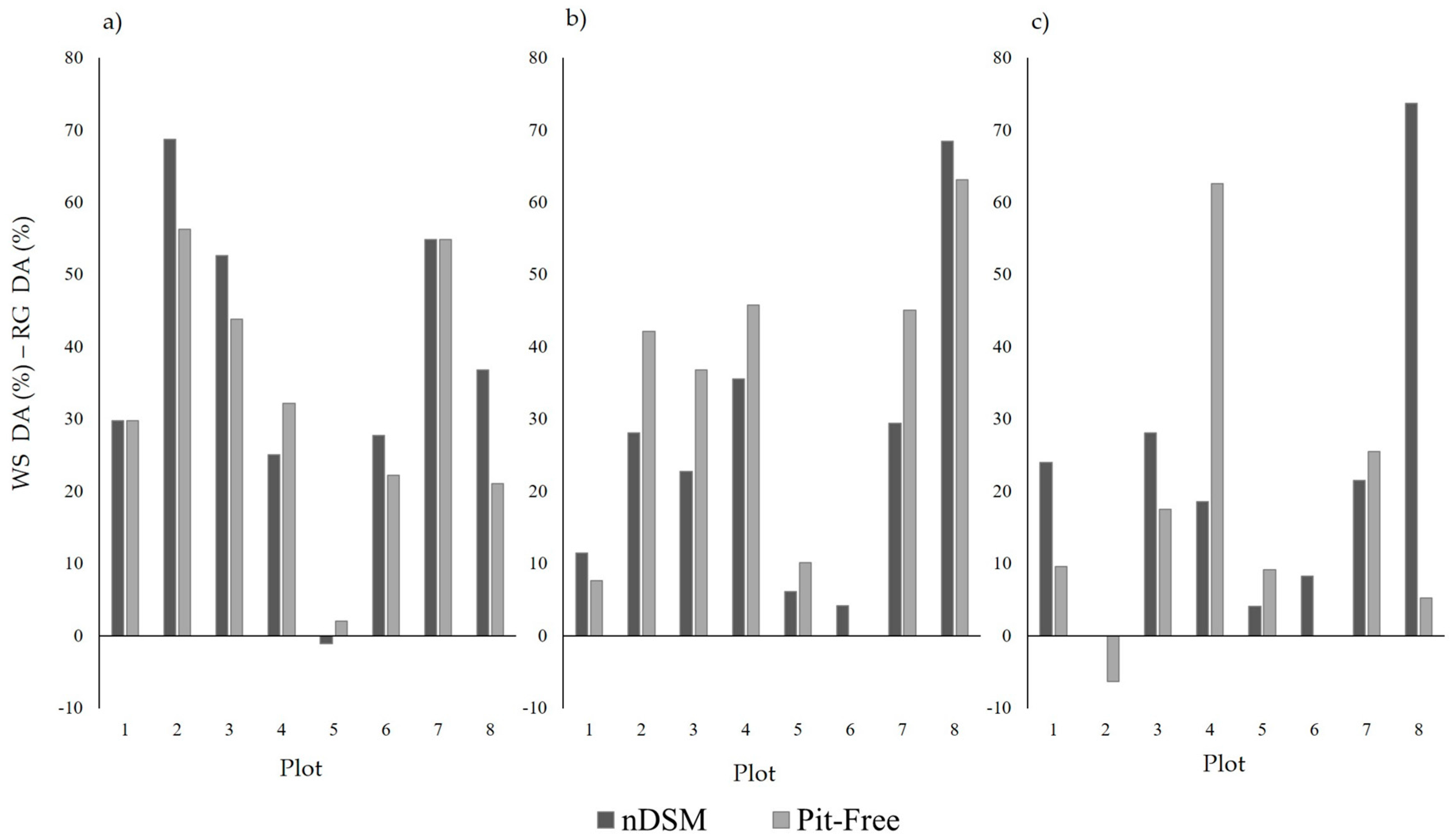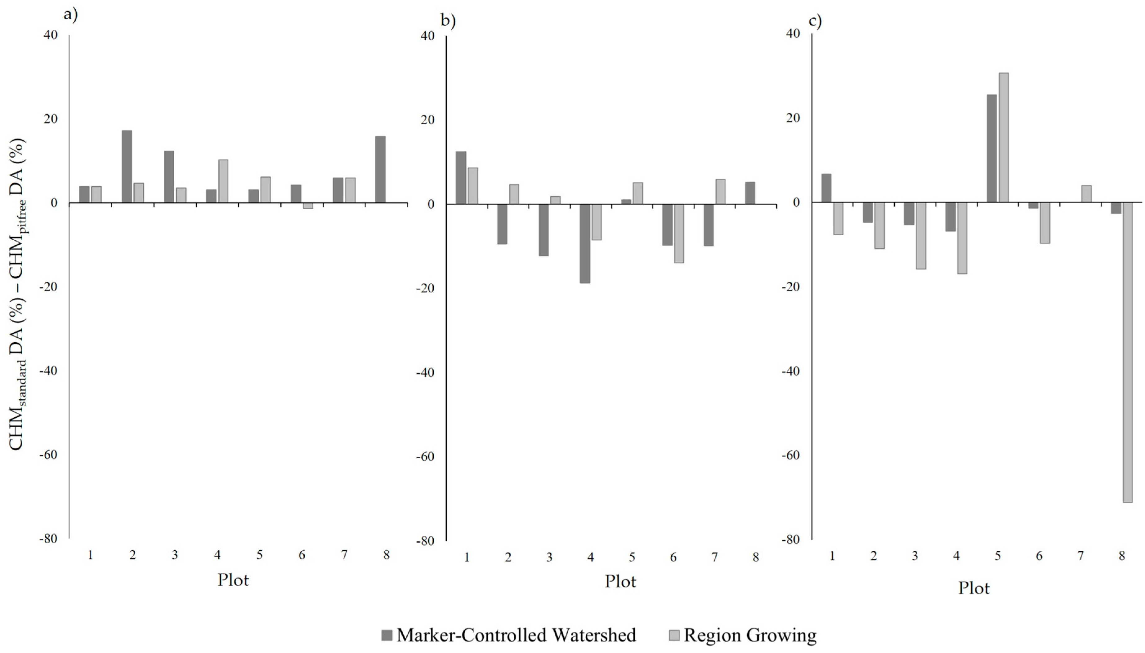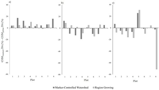 Neither CHM generation method (standard/pit-free) exhibited a consistently stronger performance, with each outperforming the other for four of the eight sample plots. This is different from the results observed by Khosravipour et al. [