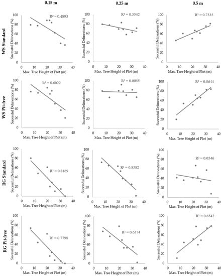 In relation to each of the CHM resolutions, several observed relationships require further discussion. Firstly, the 0.25 m CHM resolution performed consistently well across all sample plots, especially for the marker-controlled watershed segmentations, suggesting that this pixel size may be most suitable for the two study areas as a whole. This implies that at the 0.25 m resolution, enough detail is provided for the majority of ITCs to delineate boundaries without high levels intra-canopy variation resulting in over segmentations. However, in the cases of plots which exhibited a large maximum tree height (>30 m), the application of a lower resolution CHM (0.5 m) typically facilitated a greater percentage of successful ITC delineations. Again, the level of intra-crown variation provided in the CHM is likely to be the causal factor for this observation. With regard to the higher resolution CHMs (0.15 m) tested, a relationship between pixel size suitability and maximum tree height was also evident. In this instance, plots characterised by a small maximum tree height (<20 m) in general produced higher percentages of successful ITC delineations.