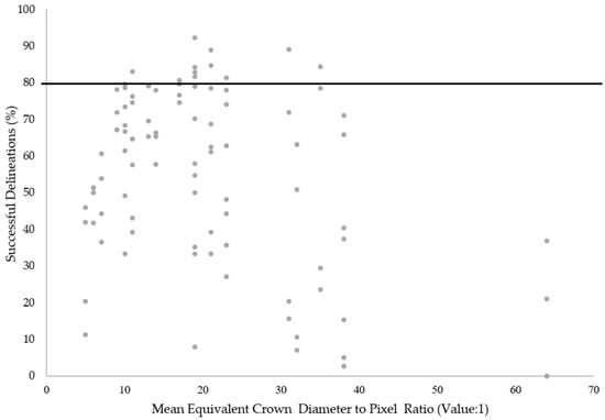 20] described the ratio between crown diameter and pixel size in order to address this point. The optimum ratio will vary in accordance with the sensitivity of segmentation algorithms to intra-crown irregularity and the distinction of crown boundaries, but can provide a useful tool in considering the influence of pixel size on ITC delineation success. Nevertheless, the insufficient availability of data regarding the relationship between pixel size and tree crown dimensions makes it difficult to determine specific recommendations for selection [