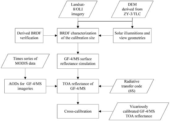 In this paper, a cross-sensor calibration technique for moderate- to high-spatial-resolution data with large-angle observation is used. The well-calibrated nadir view of Landsat-8/OLI data and the DEM product derived from ZY-3/TLC are firstly used together to fit the BRDF characterization of the calibration site. The retrieved BRDF is then used to simulate the surface reflectance under GF-4/PMS’s solar illumination and view geometries. Thirdly, the TOA reflectance of PMS is calculated using the simulated surface reflectance and Aerosol Optical Depths (AODs) retrieved by times series of MODIS data. Finally, the cross-calibration of GF-4/PMS is performed. The procedure is illustrated in Figure 1 and the major steps are discussed below in detail.