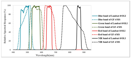 Before performing the cross-calibration of the GF-4/PMS, we first estimate the spectral properties. The spectral response function (SPF) of the GF-4/PMS and the Landsat-8/OLI are plotted in Figure 3. To derive the GF-4/PMS reflectance of the calibration site, the spectral discrepancy is taken into account and the spectral matching factor is used. Given the ground-measured spectrum of the site, and the SPFs of both the GF-4/PMS and Landsat-8/OLI, the spectral matching factor can be calculated by the Equation (1) [2,3,23]: