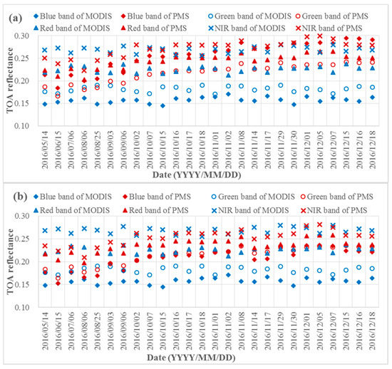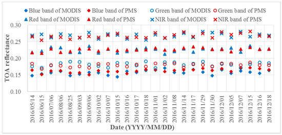 In order to observe the improvement before and after the cross-calibration of the GF-4/PMS, we compared the TOA reflectance between the PMS after cross-calibration and MODIS images, and the results are shown in Figure 6. The maximum difference of TOA reflectance between MODIS and GF-4/PMS is 11.09% for the blue band, 9.33% for the green band, 7.34% for the red band and 6.61% for the NIR band. From the comparison, the tendency of the TOA reflectance of PMS has been more stable, and the TOA reflectance values are closer with MODIS. All of the above proved that the radiometric capability of the GF-4/PMS has been improved by cross-calibration.