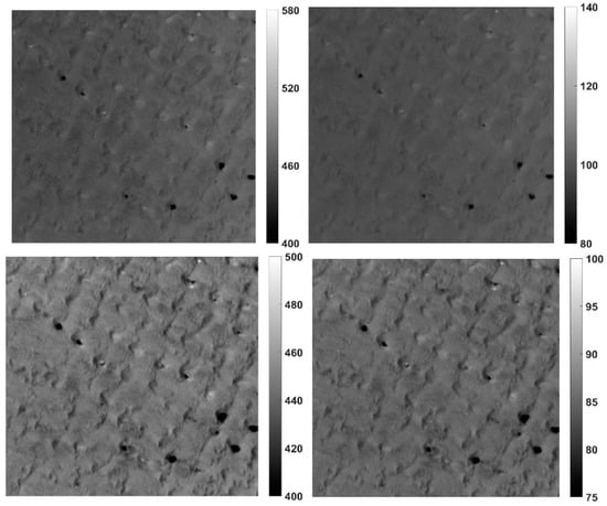 With the derived surface reflectance and the AOD retrieved by MODIS imagery, the TOA radiance of GF-4/PMS is calculated using the 6S model. An example of the simulated TOA radiance and its corresponding GF-4/PMS image on 15 June 2016 in blue and green bands are shown in Figure 5. The mean TOA radiance and DN for every GF-4/PMS image are listed in Table 8.