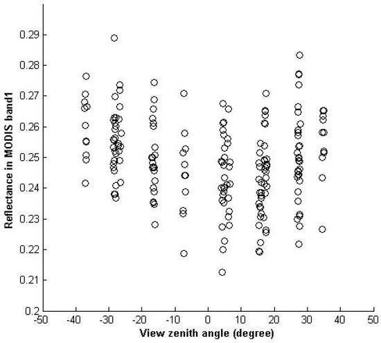 In fact, the difference of the view zenith angle between OLI and PMS will impact the cross-validation result. Figure 7 gives an example of the angle effect of the red band of Terra/MODIS. The reflectance varies with relative azimuth and solar zenith angle for each bin of view zenith angle, which shows systematic variation that is due to directional effects. The directional effect is about 15%. Furthermore, from Table 11, it can be found that the blue band of PMS has a higher error than other three bands. This is mainly due to the blue band having the shortest wavelength and most likely to be affected by atmospheric conditions of the four bands.