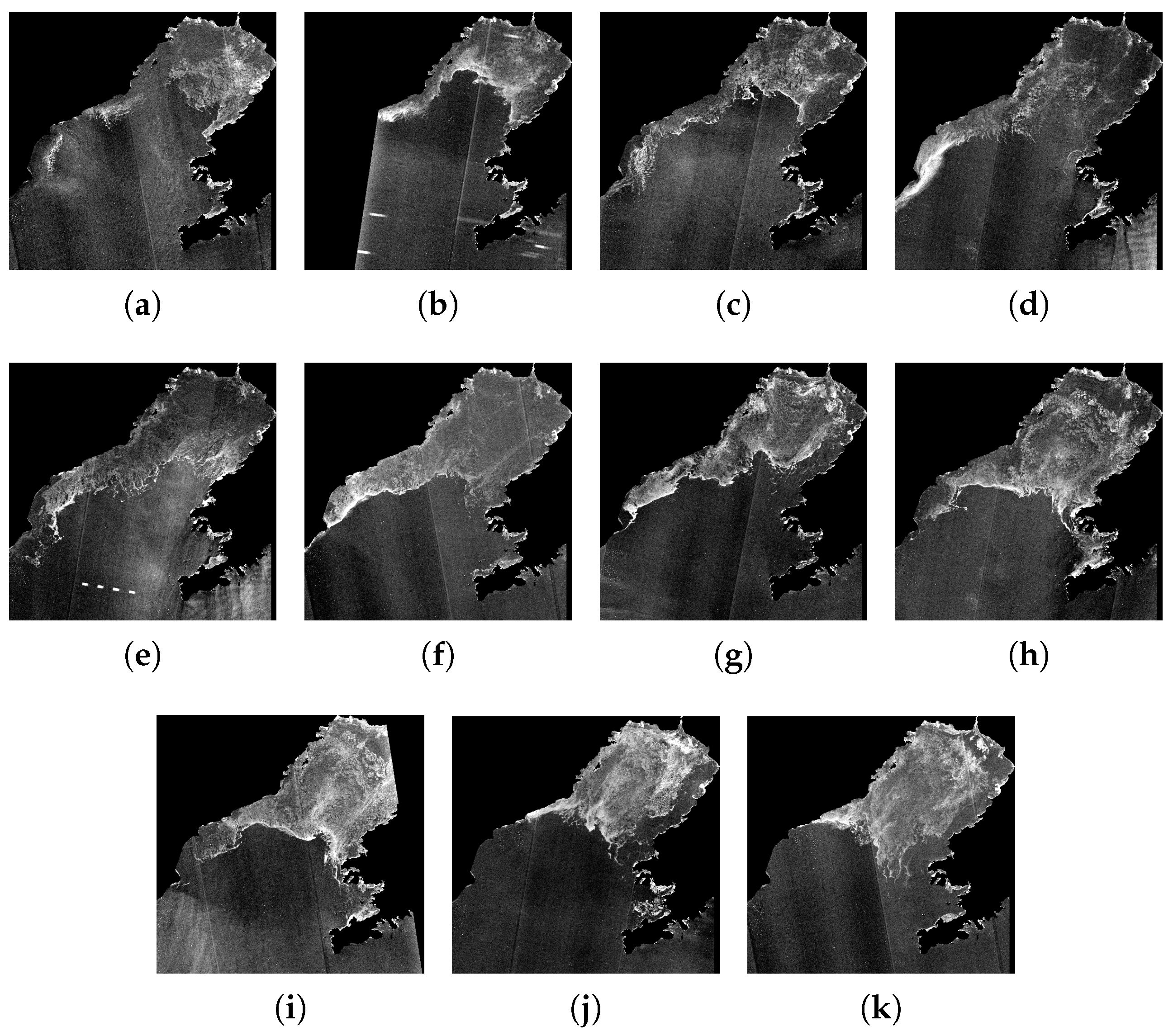 - Karvonen, J. Baltic Sea ice concentration estimation based on C-Band HH-Polarized SAR data. IEEE J. Sel. Top. Appl. 2012, 5, 1874–1884. [Google Scholar] [CrossRef]