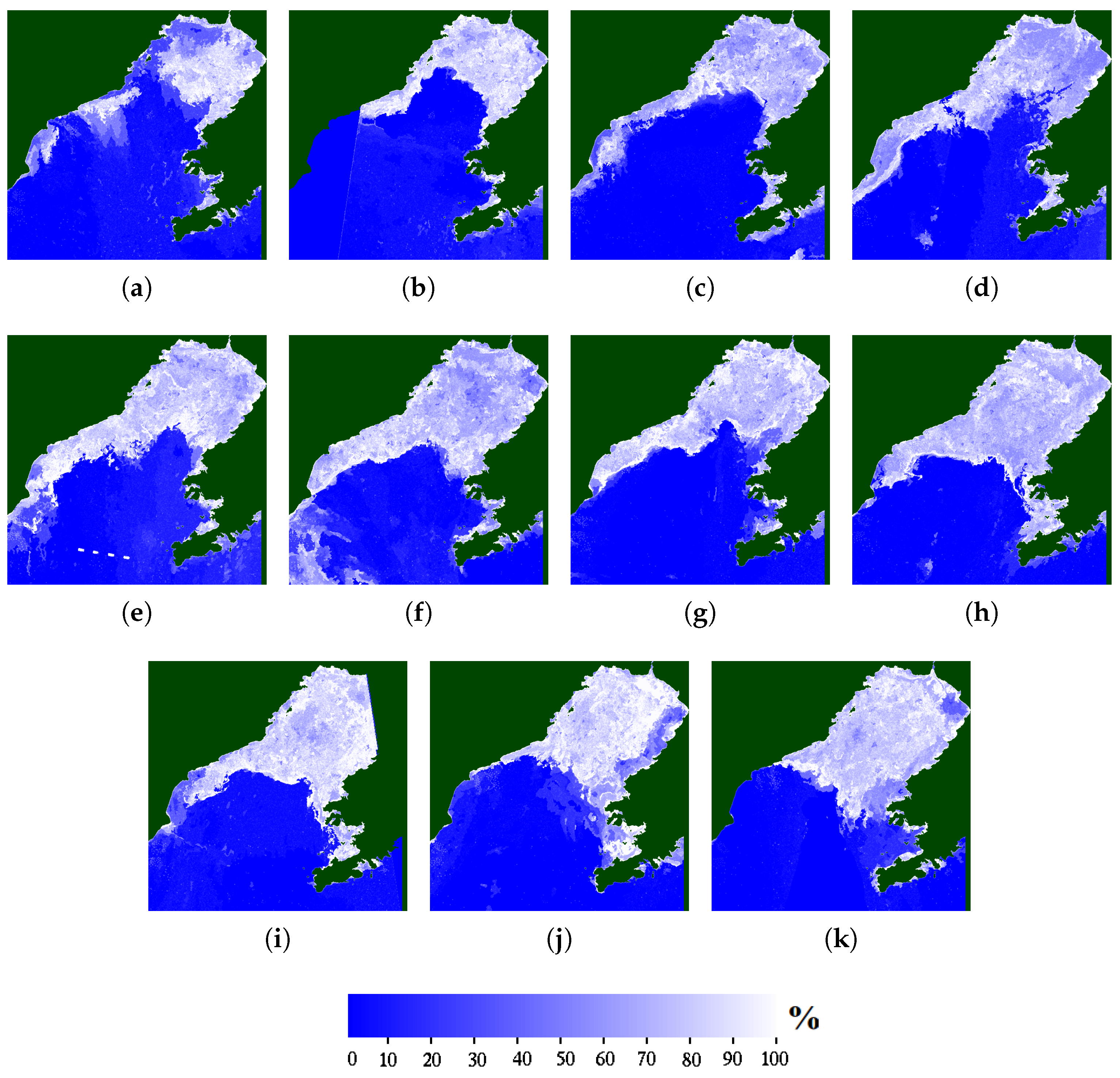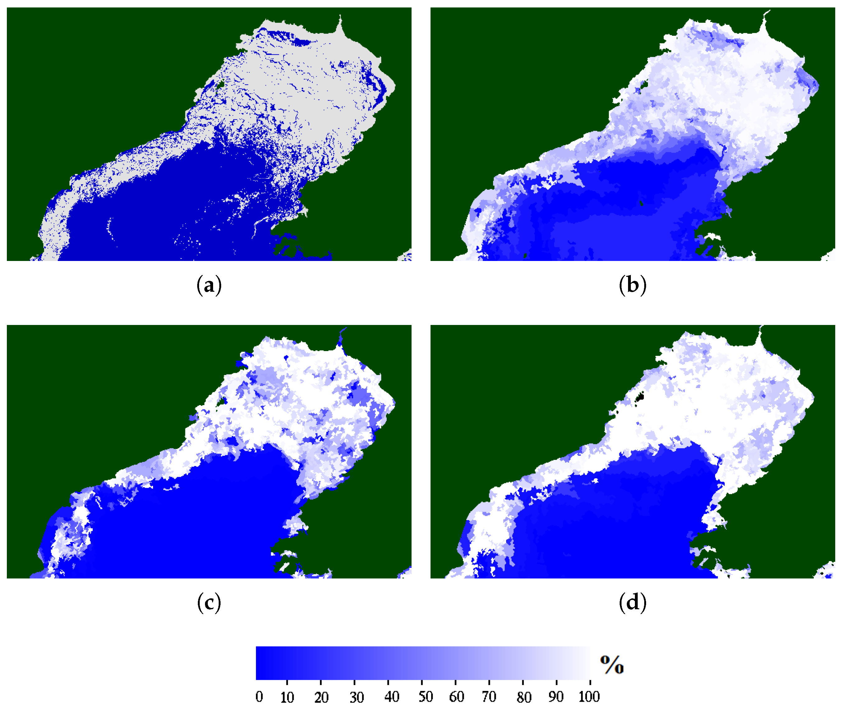 - Su, H.; Wang, Y.; Yang, J. Monitoring the spatiotemporal evolution of sea ice in the Bohai Sea in the 2009–2010 winter combining MODIS and meteorological data. Estuar. Coasts 2012, 35, 281–291. [Google Scholar] [CrossRef]