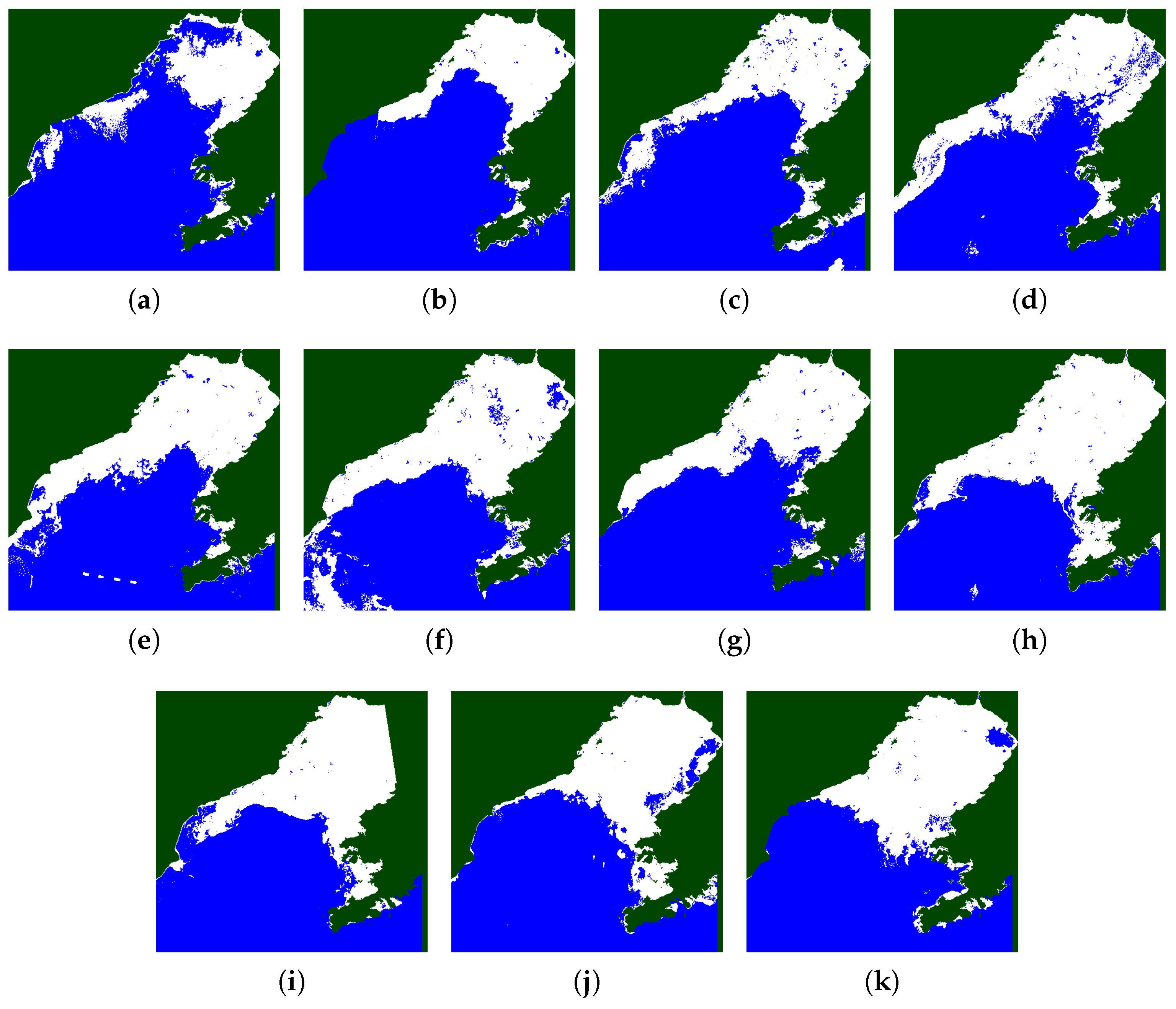 - Yuan, S.; Gu, W.; Xu, Y.; Wang, P.; Huang, S.; Le, Z.; Cong, J. The estimate of sea ice resources quantity in the Bohai Sea based on NOAA/AVHRR data. Acta Oceanol. Sin. 2012, 31, 33–40. [Google Scholar] [CrossRef]