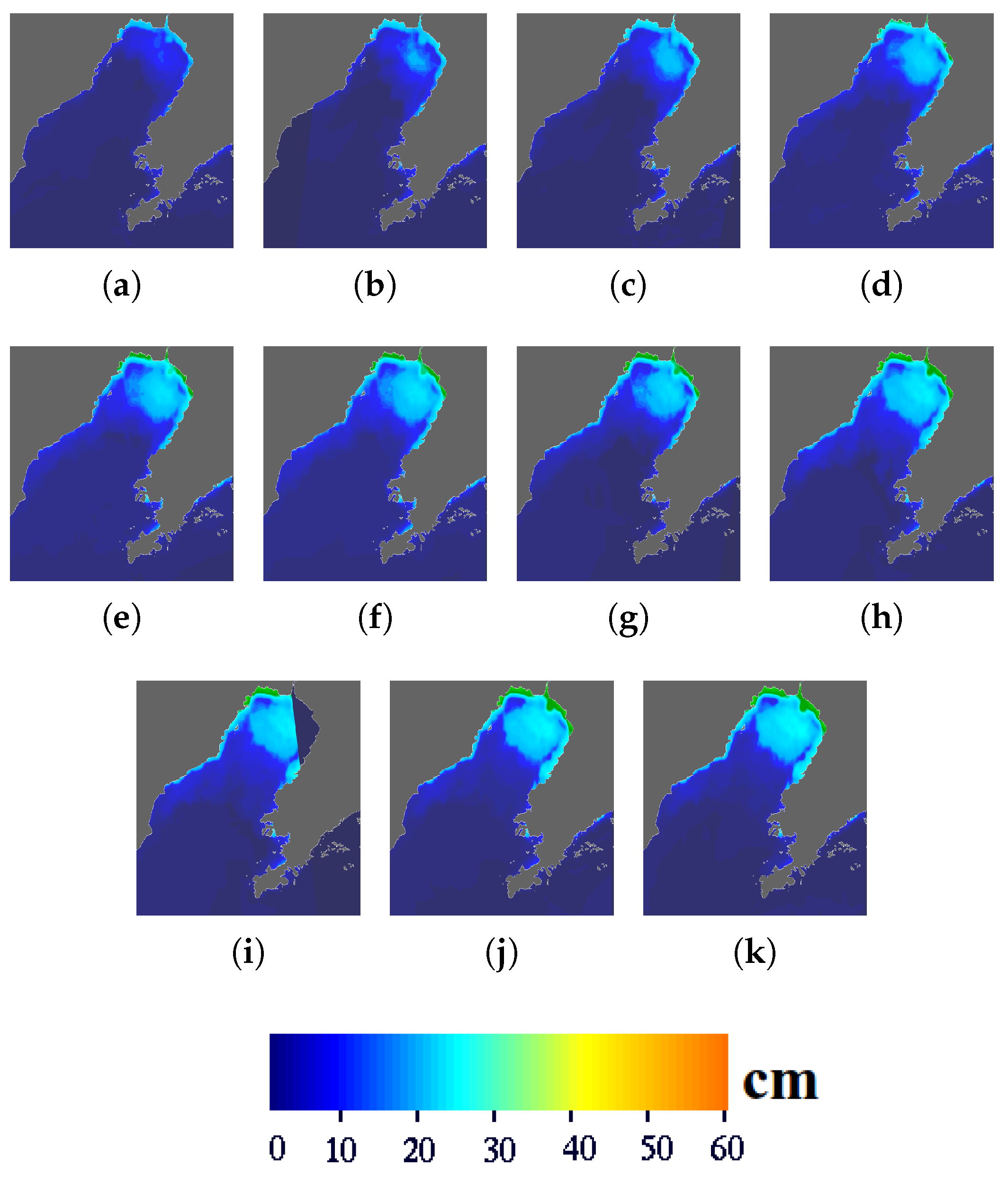 - Liu, C.; Wei, G.; Chao, J.; Yuan, S.; Xu, Y. Spatio-temporal characteristics of the sea-ice volume of the Bohai Sea, China, in winter 2009/10. Ann. Glaciol. 2013, 54, 97–104. [Google Scholar] [CrossRef]