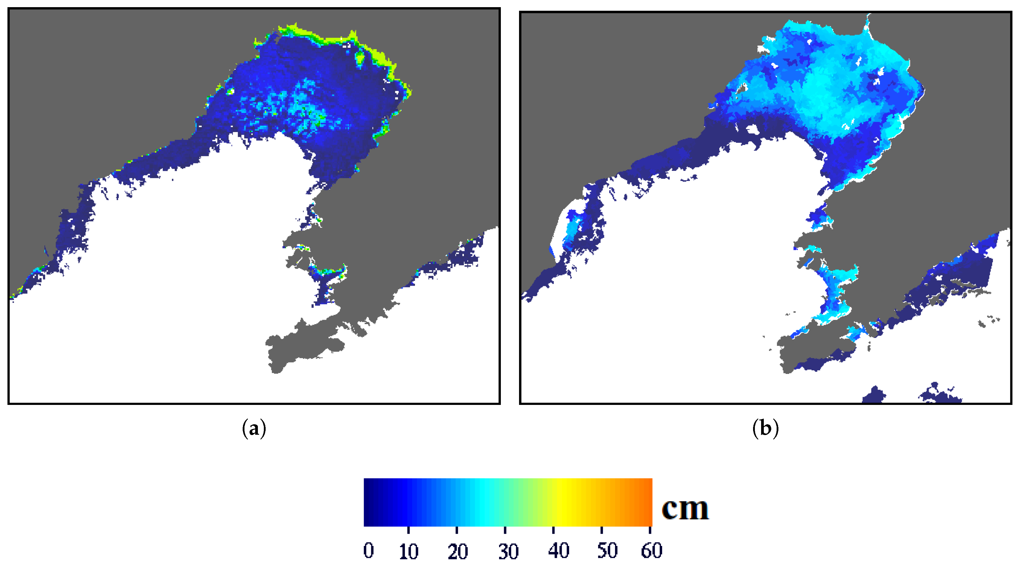 - Su, H.; Wang, Y. Using MODIS data to estimate sea ice thickness in the Bohai Sea (China) in the 2009–2010 winter. J. Geophys. Res. 2012, 117, C10018. [Google Scholar] [CrossRef]