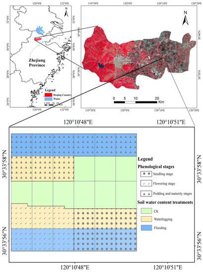 Field experiments (Figure 1) were conducted from October 2014 to May 2015. Different soil water content treatments were carried out to map the variability of crops in seasonal growth stages under waterlogging conditions. The experiment farmland is about 10,000 m2 and flat, which is divided into 30 rectangular plots about 18 × 18 m by crisscrossing ditches with 30 cm depth and 20–30 cm width. The treatment plots were comprised of three different soil water content treatments, i.e., flooding (F) (filling with water to reach a level of 2–3 cm above the soil surface), waterlogging (W) (waterlogging with a water layer and ground at the same level), and contrast check (CK) (a recommended level of water content). Seeds were directly sown in the field around 26 October 2014 and harvested in 16 May 2015. Different soil water content treatments were imposed at three growth stages: seedling stage (8 January 2015 to 28 January 2015); flowering stage (17 March 2015 to 5 April 2015), and podding stages (21 April 2015 to 1 May 2015), respectively. The field managements followed standard agricultural practice.