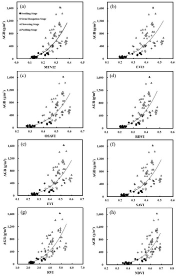 Linear or near-linear relationships had been established between the measured AGB and the selected VIs using the calibration dataset [14,41]. We tested linear, logarithmic, quadratic, power, and exponential regression models, and only the models that provided the best fit between the measured AGB and the selected VIs were reported.