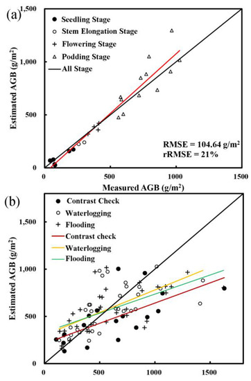 To further validate the estimation accuracy of different growth stages and different soil water content treatments, we compared the estimated AGB with different soil water content treatments’ measured AGB (Figure 3b) and different growth stages’ measured AGB (Figure 3c). For different soil water content treatments, the CK, waterlogging, and flooding treatment showed an underestimation at the higher AGB. However, the waterlogging and flooding treatment had a better validation accuracy compared of the contrast check, for the regression lines of the treatments were closer to 1: 1 line in Figure 3b. Moreover, the RMSE and rRMSE for the CK, waterlogging, and flooding treatment were calculated, with the corresponding RMSE being 324.93 g/m2, 245.93 g/m2, and 283.45 g/m2, rRMSE being 52%, 42%, and 46%, respectively. Results disclosed that the waterlogging and flooding treatment can improve the model performance for biomass estimation. For the validation at different oilseed rape growth stages, Figure 3c showed the seedling stage and stem elongation stage performed a slight overestimation at higher AGB. However, the flowering stage and podding stage showed an underestimation at higher AGB while an overestimation at lower AGB. Moreover, the slope of regression model showed that the flowering stage and podding stage apparently have greater impacts on the accuracy verification.