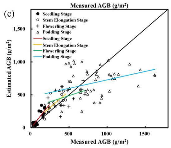 Comparison between measured AGB and estimated AGB. The black dash line is the 1:1 line and the colorized solid lines are the linear regression trend lines. The data set we used were: (a) the validation set; (b) the data collected from the plots conducting, or had finished with, the soil water content stress treatments; (c) the data collected from different growth stages.