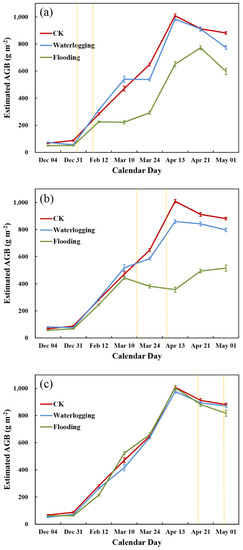 Variation of the estimated AGB for different soil water content treatments from 2014 to 2015 growth stages. (a–c) represents the soil water content treatments imposed at seedling stage, flowering stage, and podding stage, respectively. The shallow orange vertical lines mean the date of waterlogging treatments imposed at three growth stages, respectively.