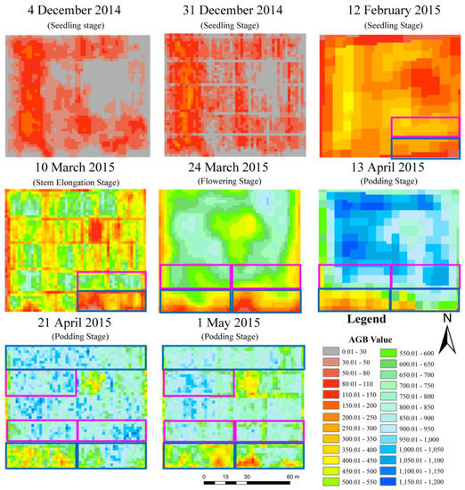 To investigate the dynamic maps of winter oilseed rape growth conditions in Deqing County, the estimating model based on NDVI (Equation (4)) was applied to high spatial resolution satellite images during the crop growing season (from October 2014 to May 2015) of winter oilseed rape. The seasonal change of winter oilseed rape field is shown in Figure 5. Patterns of different soil water content treatments can be observed from the maps. The growth conditions are broadly consistent throughout the entire fields and vegetation growth stages, apart from the areas with flooding treatment. The winter oilseed rape was at the early emergency stage from 4 December 2014 to 31 December 2014, with AGB gradually growing evenly at an extremely low level. The oilseed rape developed slowly until 24 March with an average AGB of 450 g/m2, and quickly increased to an AGB maximum value of about 1200 g/m2 on 13 April, then showed a slight decrease on 21 April. On 10 March 2015, the flooding treatment imposed on the seedling stage showed a great difference on the map. Meanwhile, the flowering stage treatment could be easily distinguished from others on the map on 13 April.