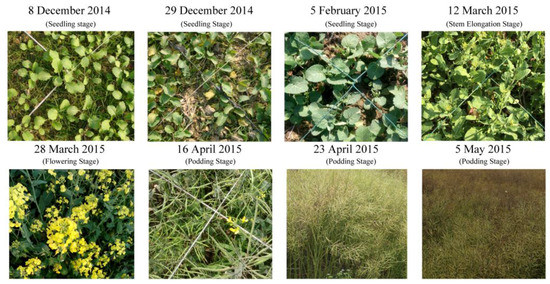 In recent years, many quantitative procedures have been proposed for water states based on the water budget and plant indicators, mainly based on sensing the plants’ response to water stress rather than directly detecting the soil moisture status [9]. Few studies have been conducted on different growth stages of field-grown oilseed rape under varying soil moisture [4,10,11]. Detailed field experiments have been predominantly directed toward analyzing the impacts of soil water content variability on physiological parameters and fruit yield [8,12,13]. Indeed, water productivity relates crop production to water use and is a key indicator for evaluating agricultural water management [9]. Information about vegetation growth and health in the developing season is crucial for optimizing crop production; leaf area index (LAI) and above-ground biomass (AGB) are some very useful indicators for crop growth and health, which can be used to guide the field managements as well as adjustments and requirements [14]. Traditional field validation of relevant parameters of cover crop growth through destructive sampling are time and cost intensive, which can become particularly cumbersome for regional studies [15]. Remote sensing offers a rapid and cost-effective way to capture valuable information about agriculture condition over large areas, which can greatly reduce the workload involved in crop investigation or in-field observation and offer the possibility to analyze plant biochemical conditions at a wide range of spatial scales [16]. Moreover, remote sensing techniques, as well as multispectral reflectance, can provide quantitative information about the water status of many agricultural crops [17,18]. Since the first satellite was launched in 1972, a fair amount of available remote sensing datasets and images have become the basic tools for land cover mapping, environmental monitoring, and ecological process scaling from stand to regional and global levels [19,20]. Meanwhile, time series observation is particularly important for monitoring seasonal changes in plant growth and development and for studying canopy function [21].