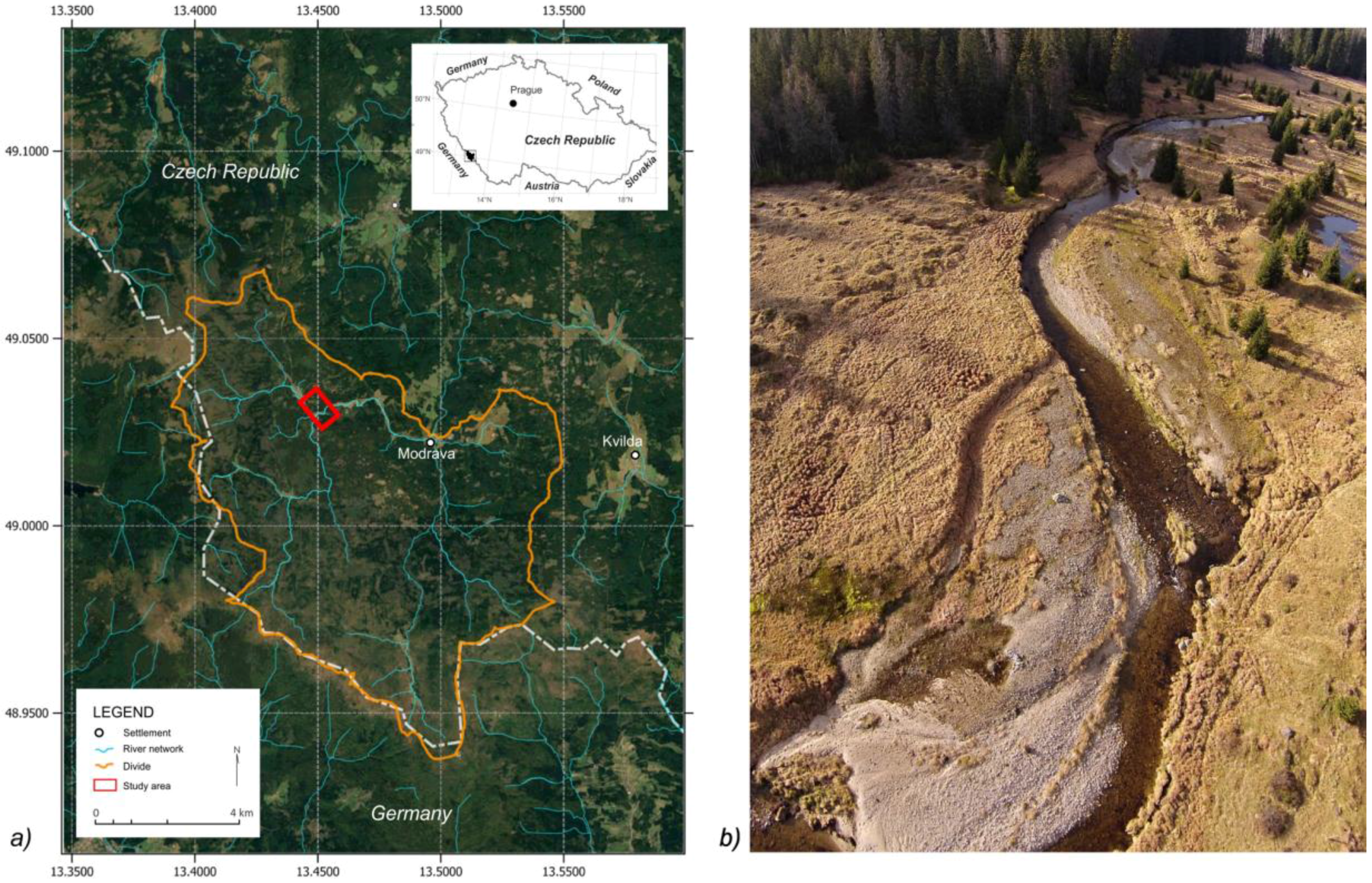 Study area: (a) Map of the study area; and (b) overview of the study site at Javoří Brook. Photo by J. Langhammer, 2014.