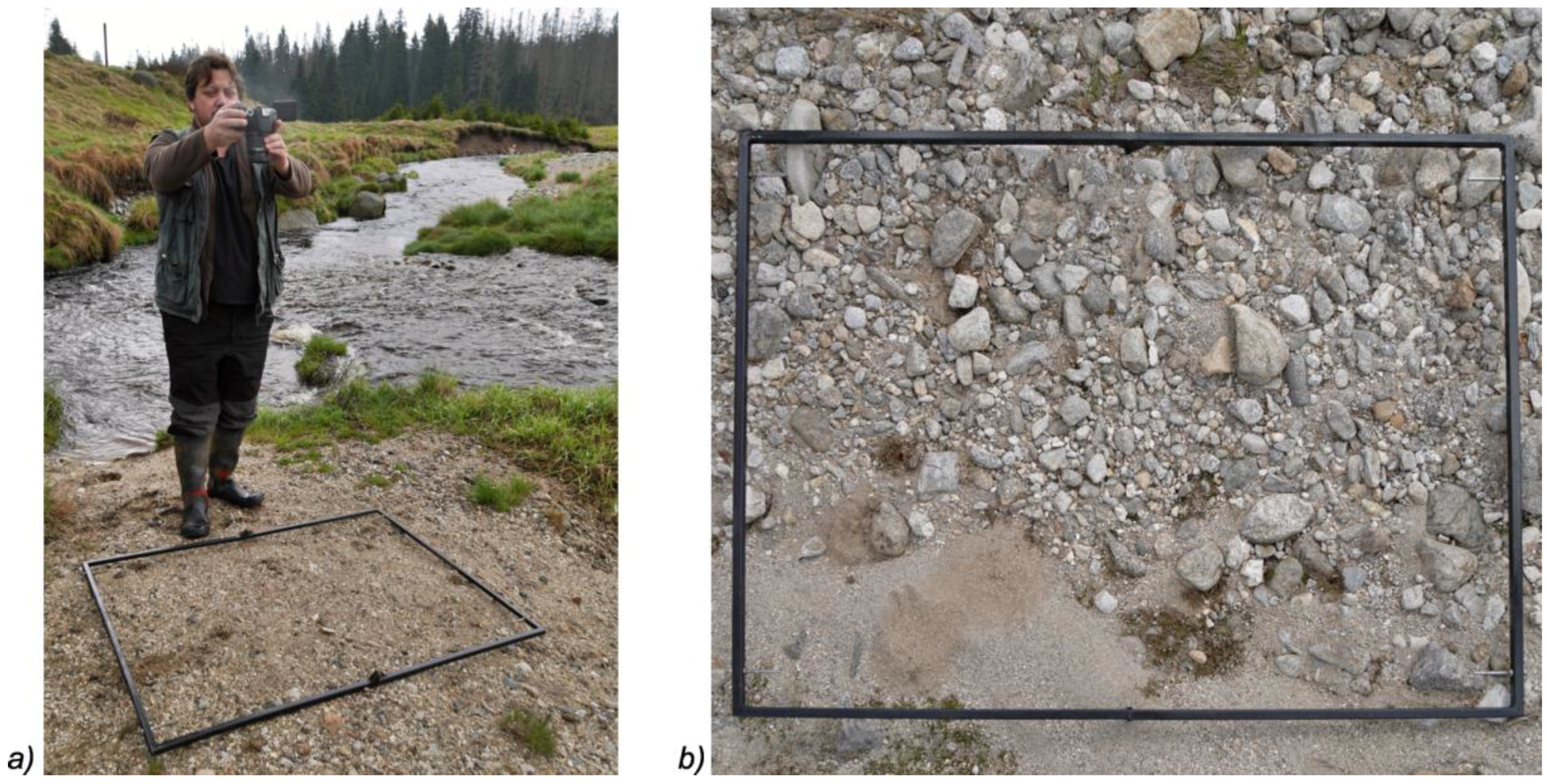 Digital optical granulometry: (a) Taking photographs of samples of gravel material; and (b) detail of the sample, taken with calibration frame. Photo by J. Langhammer, 2014.