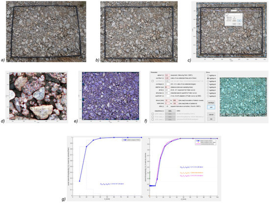 Workflow of optical granulometry image processing: (a) raw image; (b) rectified image prepared for analysis; (c) scaling and setting up of image properties; (d) identification of objects; (e) processed image with identified objects; (f) setting up classification and image analysis; and (g) resulting granulometric curves yielding results by number or volume of clasts with calculated diameter values.