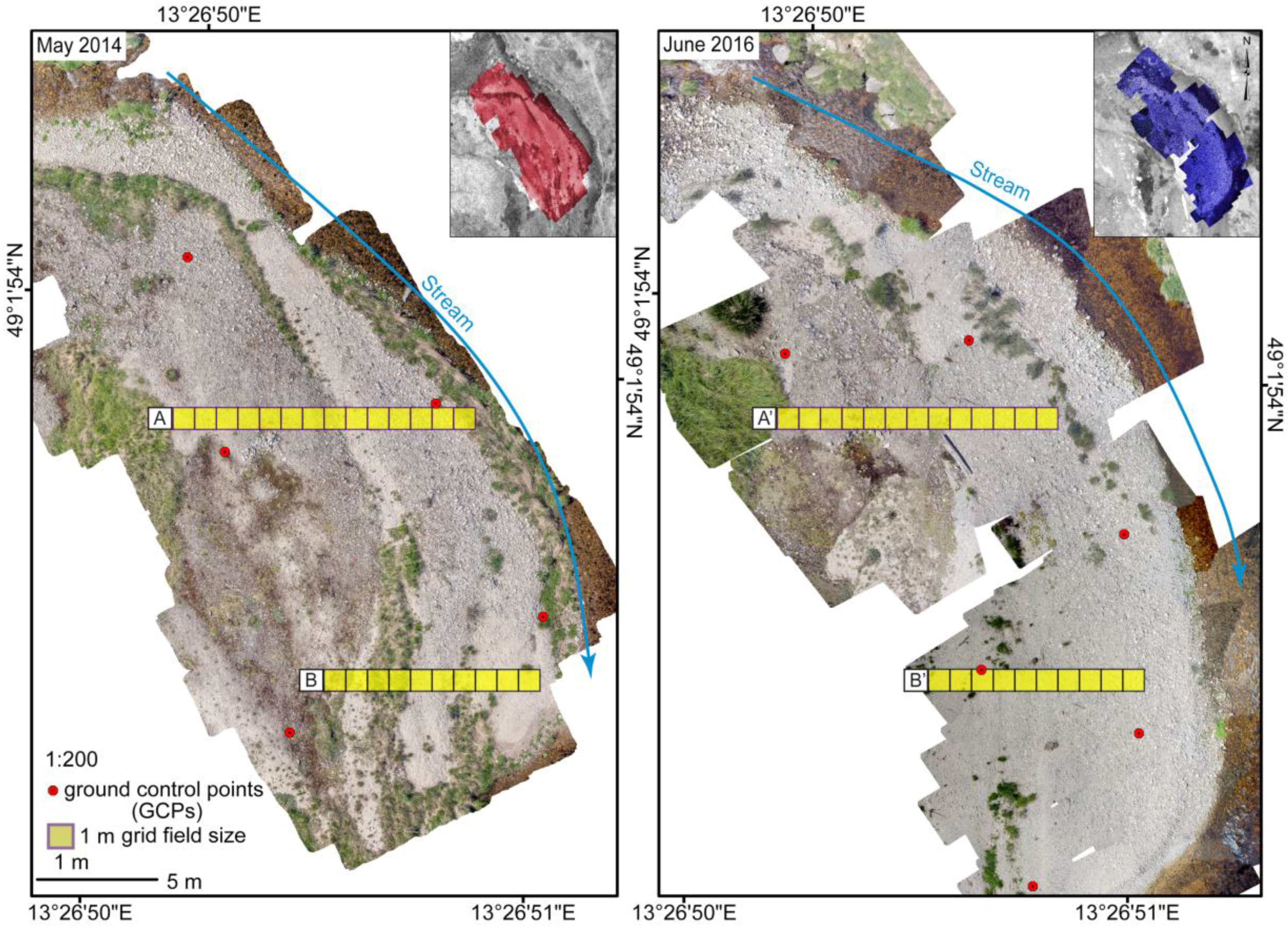 Orthoimage mosaics of the study area for all campaigns were derived from the base dataset for consequent granulometric analysis. After its first imaging in May 2014, the point bar did not reveal any apparent changes in September 2014 and May 2015 due to the limited fluvial activity of the stream. However, a flood in December 2015 resulted in significant depositions over the studied point bar. Therefore, we used imaging performed in June 2016 to represent the second time horizon within the present analysis.