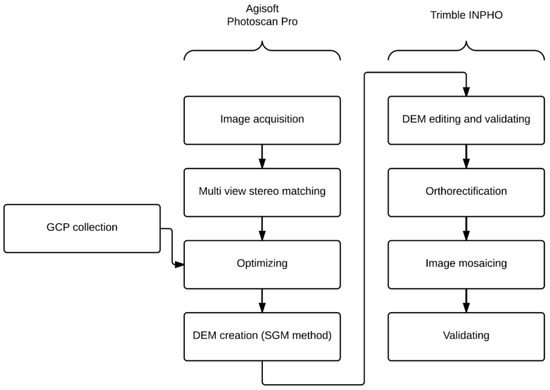 The Agisoft Photoscan Pro and INPHO packages were combined at different steps in the photogrammetric processing workflow in order to obtain the highest-quality resulting orthoimages, sampled at extremely high-resolution values. Agisoft Photoscan Pro was used to construct the dense point cloud from pairs of aligned images and to derive the DEM using the Multi-view stereo matching method. The Trimble INPHO package was then used for accurate orthorectification and mosaicking to derive reliable orthoimages from the acquired data (Figure 5).