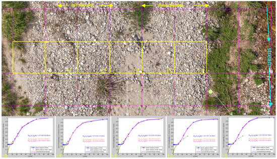The digital granulometric analysis was accomplished in two ways. First, a test transect was chosen for pre-testing the BaseGrain application to determine the optimum parameters using UAV-based imagery (Figure 6). Second, for further grain size analysis, different model transects (Figure 4) over the point bar were selected using these optimized parameters. For the test transect, we selected transect I from the regular grid built over the point bar (Figure 6) which contains a surface almost completely undisturbed by vegetation and continuously covers the zone between the stream and terrace. From these six grid fields, we selected five adjacent cells with no or minimum vegetation coverage (I-1–5, Figure 6).