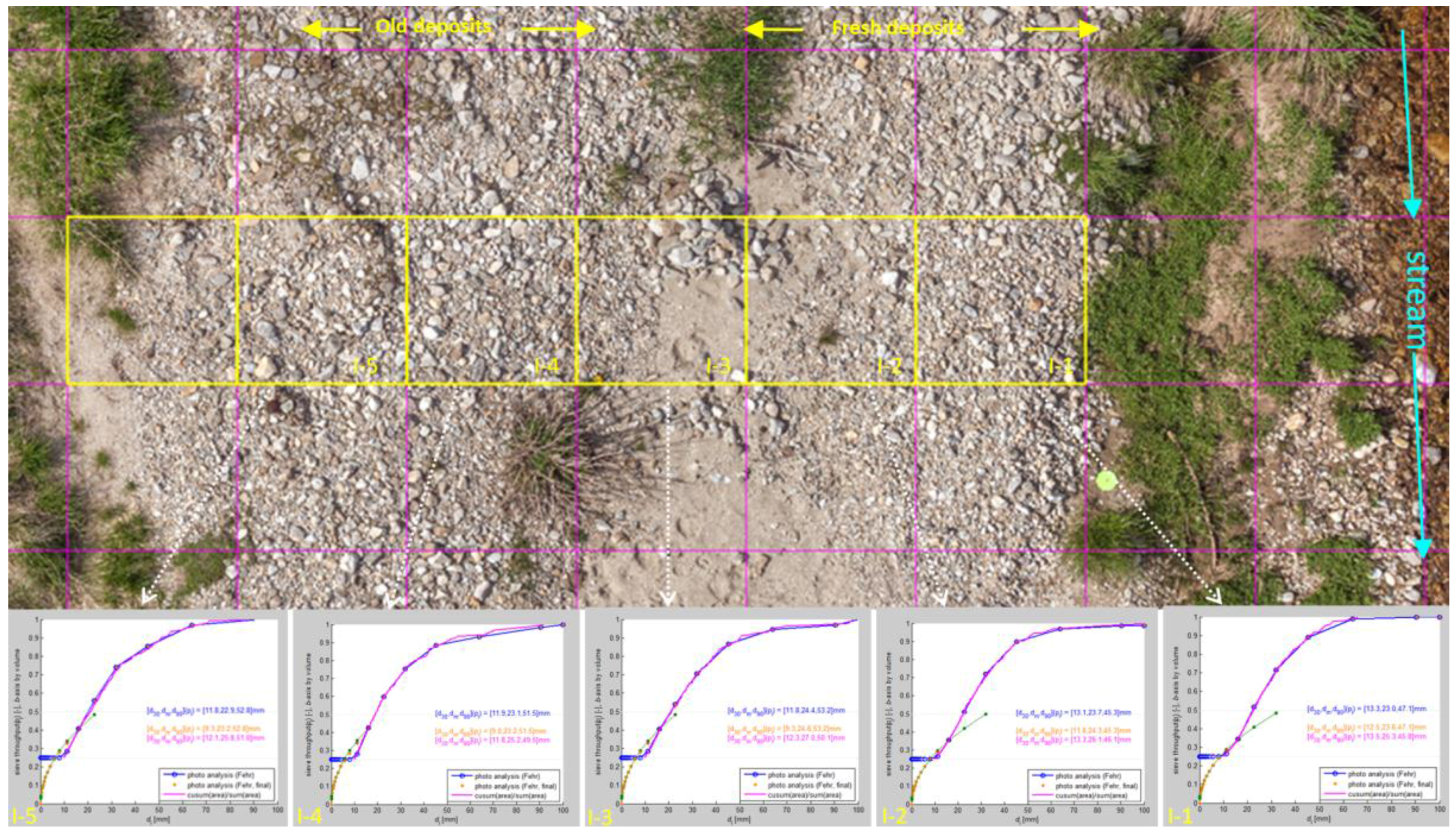 - Graham, D.J.; Rollet, A.-J.; Rice, S.P.; Piégay, H. Conversions of Surface Grain-Size Samples Collected and Recorded Using Different Procedures. J. Hydraul. Eng. 2012, 138, 839–849. [Google Scholar] [CrossRef]