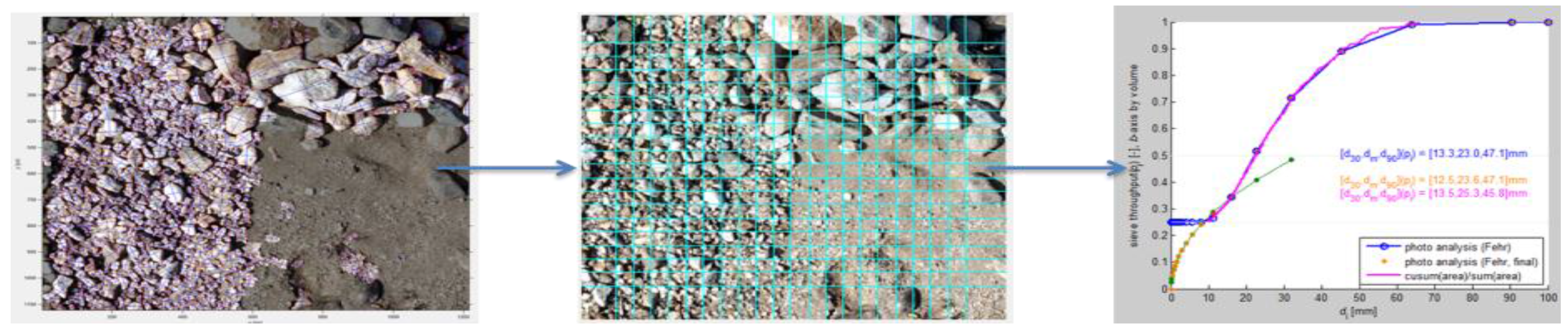 - Fehr, R. Geschiebeanalysen in Gebirgsflüssen: Umrechnung und Vergleich von verschiedenen Analyseverfahren; Versuchsanst. für Wasserbau, Hydrologie u. Glaziologie: Zurich, Switzerland, 1987. [Google Scholar]