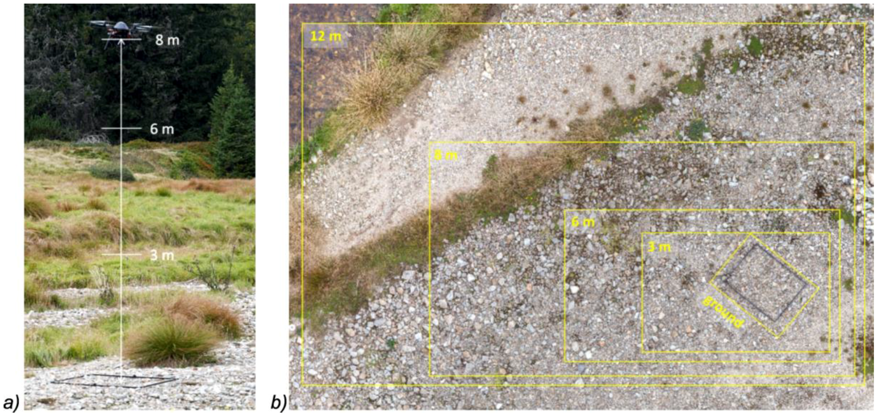 During the 2014 imaging campaign, tests were performed to verify the optimal imaging parameters, realized at different levels of the flight altitude. The aim was to test the optimum flight altitude to balance the calculated imagery resolution, needed for granulometric processing with the practical aspects of the imaging campaigns in terms of spatial coverage, securing the imagery overlaps and keeping the altitude level. This imaging was performed at different altitudes, ranging from 3 to 12 m above ground level over the sampling site (Section 3.1).