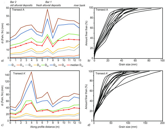 To obtain a detailed analysis of the grain size distribution across new and old accumulations within the profile of the point bar, two transects along the point bar in two different functional zones of the meander were chosen (Figure 4). The first transect A from 2014 (Figure 4) and the corresponding transect A’ from 2016 are located in the upper part of the meander, which features the coarser material at the entrance to the meander.