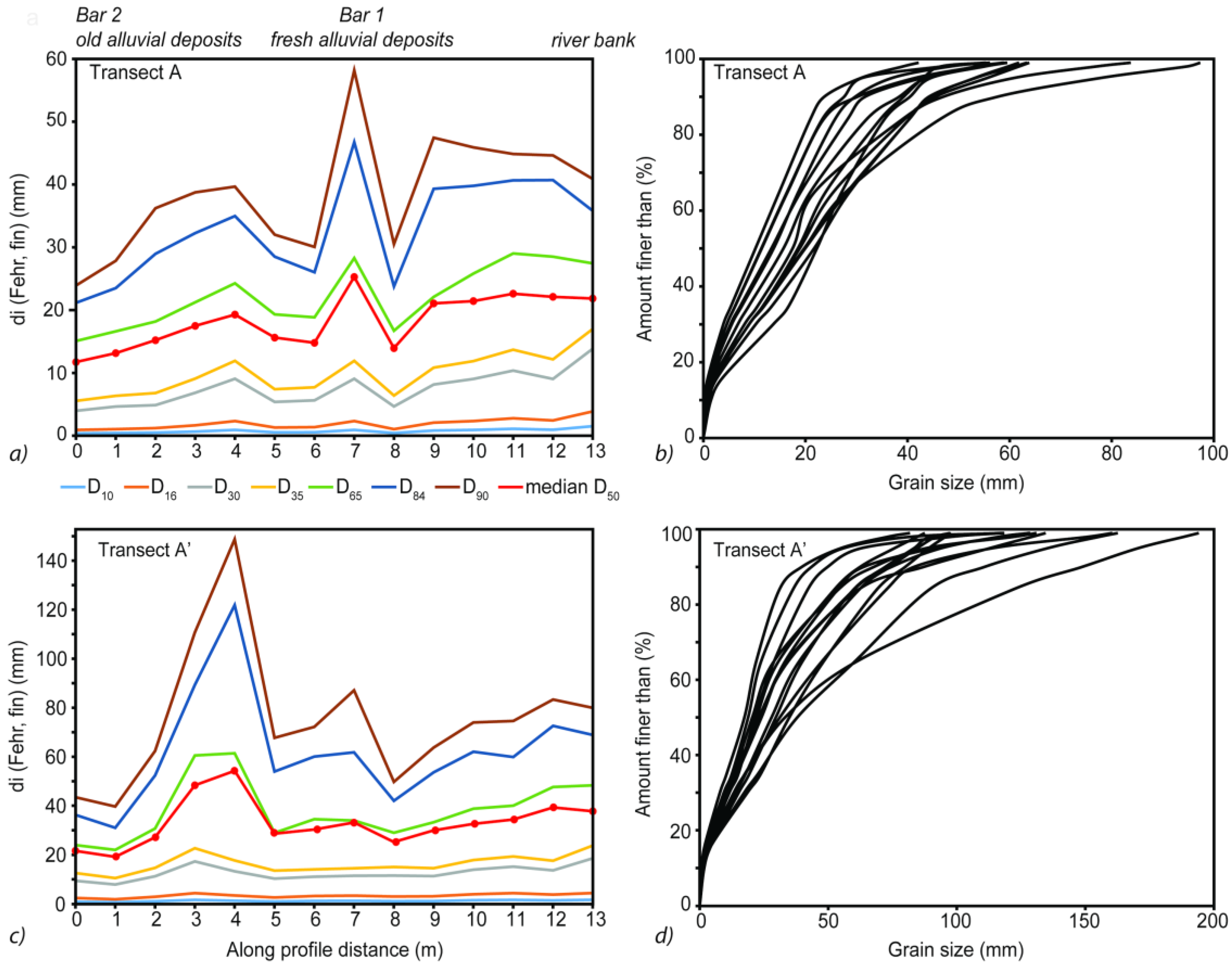 Analytical results of transects A and A’ along the point bar from May 2014. Grain size percentiles values (a-axis; mm) including D10, D16, D30, D35, D65, D84, D90 and the median grain size D50, are estimated using BaseGrain versus distance (m). D represents particle size (in mm) and the subscripts denote each particular percentile. (a) Grain size distribution over the point bar and (b) cumulative frequency of grain size in transect A, (c) grain size distribution over the point bar and (d) cumulative frequency of grain size in transect A´.