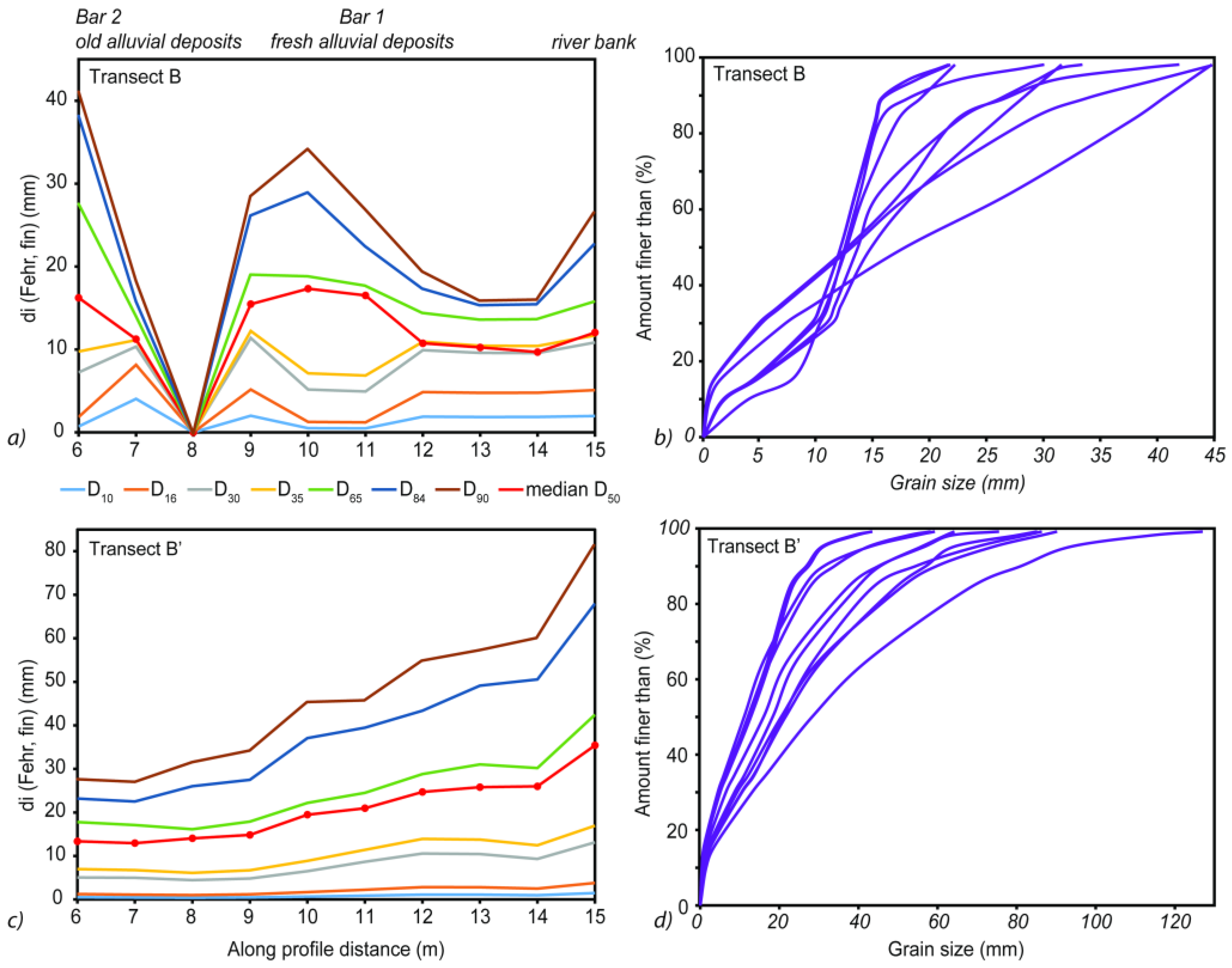 Analytical results of transects B and B’ along the point bar from May 2014. Grain size percentiles values (a-axis; mm) including D10, D16, D30, D35, D65, D84, D90 and the median grain size D50, are estimated using BaseGrain versus distance (m). D represents particle size (in mm) and the subscripts denote each particular percentile. (a) Grain size distribution over the point bar and (b) cumulative frequency of grain size in transect B, (c) grain size distribution over the point bar and (d) cumulative frequency of grain size in transect B´.
